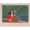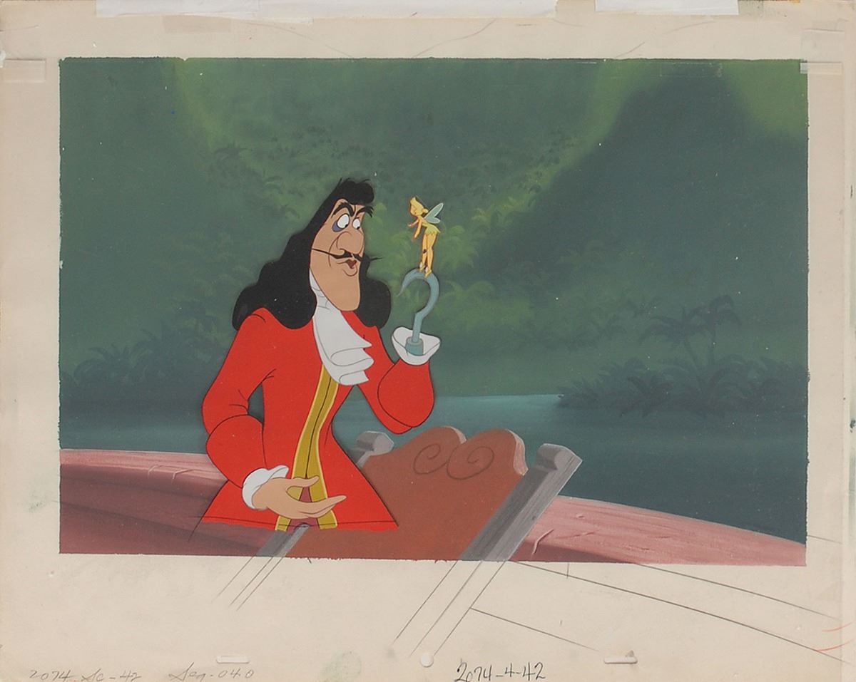 (Walt Disney Studios, 1953) Original production cels and production background featuring Captain Hook and Tinker Bell from Peter Pan, showing the pixie alighting on the surprised captain’s hook. The Tinker Bell cel has been trimmed to image and applied to the Captain Hook cel, which is placed on a hand-painted production background of Hook’s ship the Jolly Roger. Character image measures 4.25 x 6.75, with overall dimensions of 15.5 x 12.5. In fine condition. A vibrant, striking piece from a beloved Disney feature.