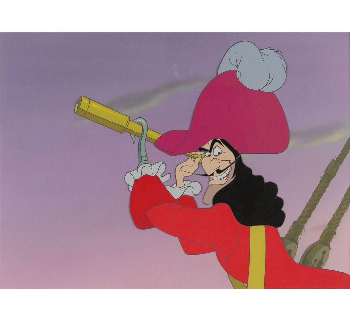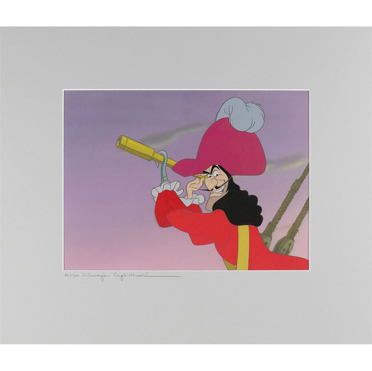 (Walt Disney Studios, 2013) Limited edition replica cel, 1/25, featuring Captain Hook issued for the 60th anniversary of Peter Pan in 2013. The cel is placed on a matching color copy background. Half-length image of Captain Hook holding his spy glass measures 9 x 8, with a mat opening of 11.25 x 8. Mat dimensions are 17 x 14.75. Accompanied by a certificate of authenticity from Disney’s Soda Fountain and Studio Store, as well as a ticket stub from the January 19, 2013, showing of the film at Hollywood’s El Capitan Theatre. In fine condition. The first cel in a limited run of 25.