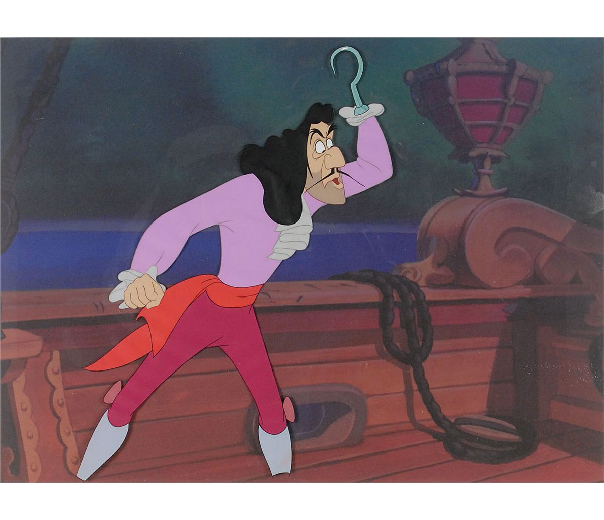 (Walt Disney Studios, 1953) Original production cel featuring Captain Hook from Peter Pan. The cel is placed on a copy background. Almost full-length image of an irate-looking Captain Hook waving his hook measures 7.5 x 10.5, with overall dimensions of 16.75 x 13. In fine condition, with a bit of mild rippling. Animated by the legendary Frank Thomas, Hook’s final persona was different than earlier versions, which portrayed him as much more callous and bloodthirsty. Fearing he would be too frightening for a younger audience, he was transformed into a more cowardly and comical villain, more suited for a family audience. A bright and colorful image of one of Disney’s most iconic villains.