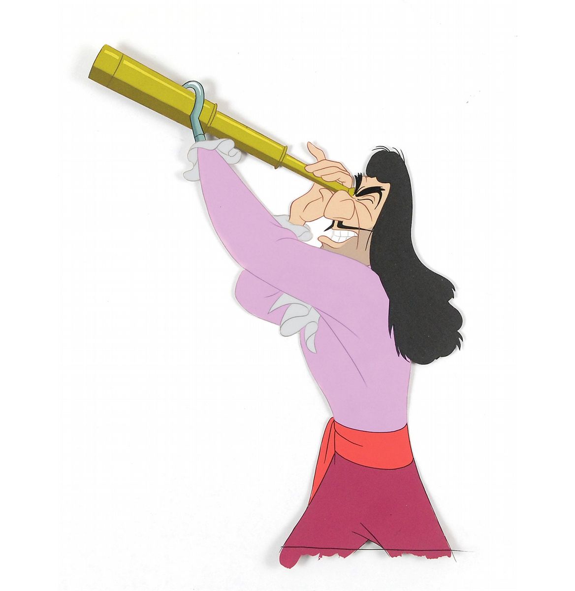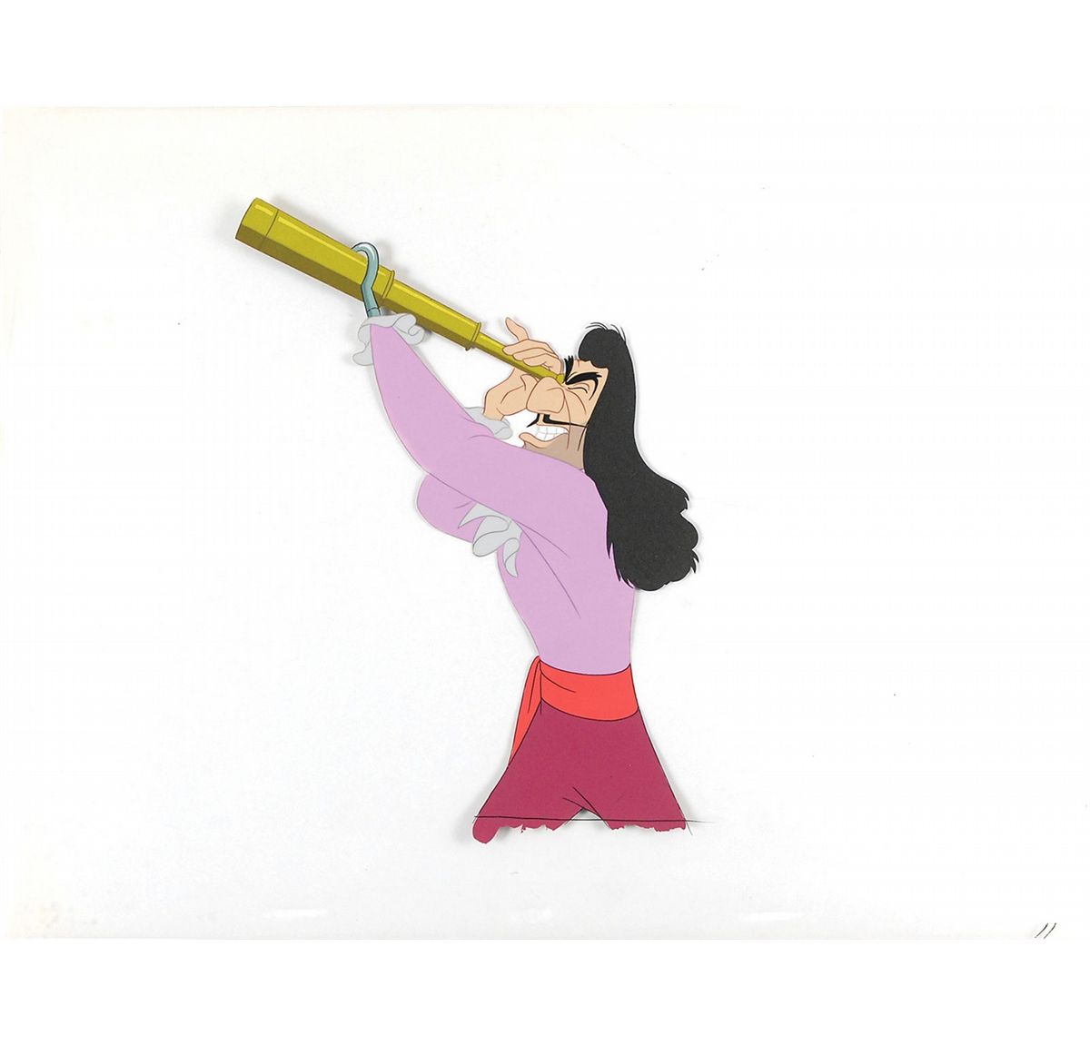 (Walt Disney Studios, 1953) Original production cel featuring Captain Hook from Peter Pan, showing the vengeful captain peering through his spyglass, supported by his namesake hooked hand. Image measures 7 x 10, with overall dimensions of 16 x 12.5. In fine condition.