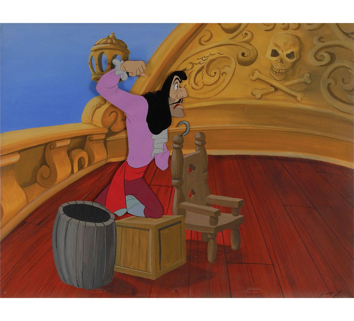 (Walt Disney Studios, 1953) Original production cel featuring Captain Hook from Peter Pan. The cel is placed on a hand-painted custom prepared background. Image measures 4.5 x 7, with overall dimensions of 16 x 13 and shows Captain Hook on the deck of the Jolly Roger. In fine condition.