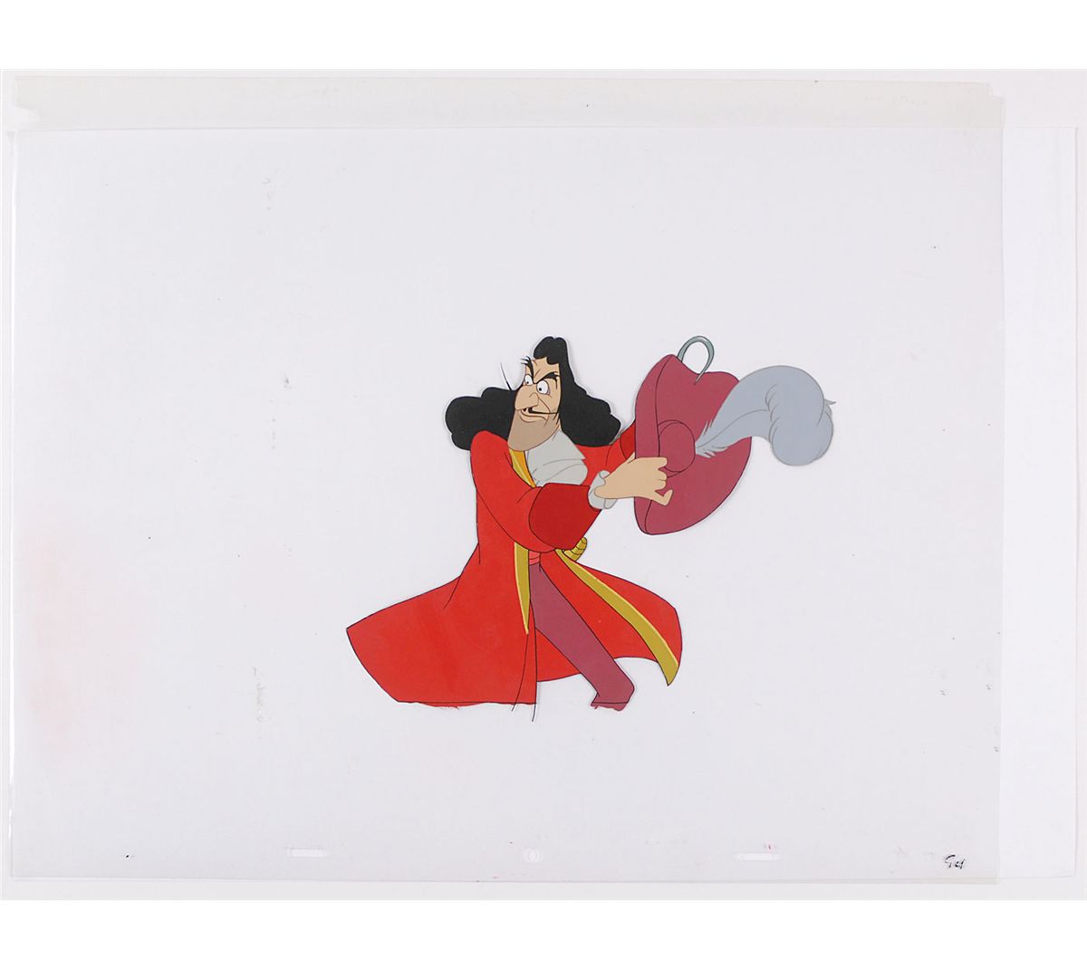 (Walt Disney Studios, 1953) Original production cel featuring Captain Hook from Peter Pan, showing the villain with his hook and feathered hat. Image measures 7.75 x 6, with overall dimensions of 15.5 x 12.5. A few surface marks and a noticeable crack to the lower left of the celluloid, otherwise fine condition.