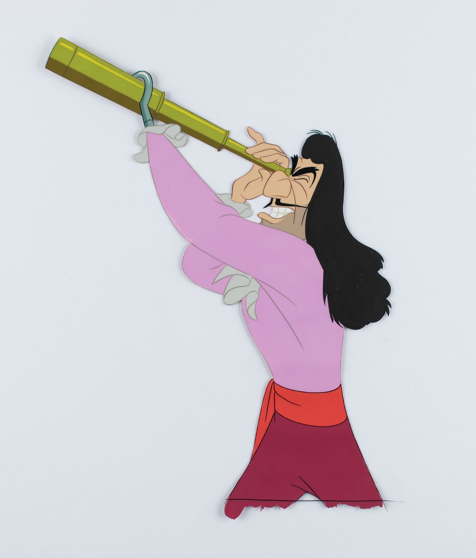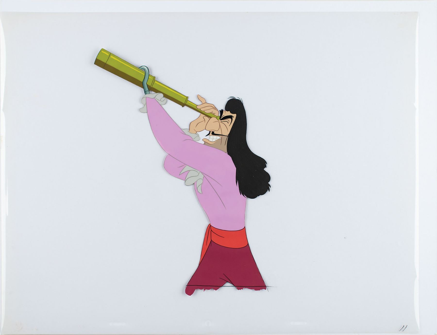 (Walt Disney Studios, 1953) Excellent original production cel of Captain Hook from Peter Pan, showing the one-handed pirate in a half-length pose looking through a telescope. The cel is marked "11" in the lower right corner. Image measures 7 x 9, with overall dimensions of 16.25 x 12.5. In fine condition.