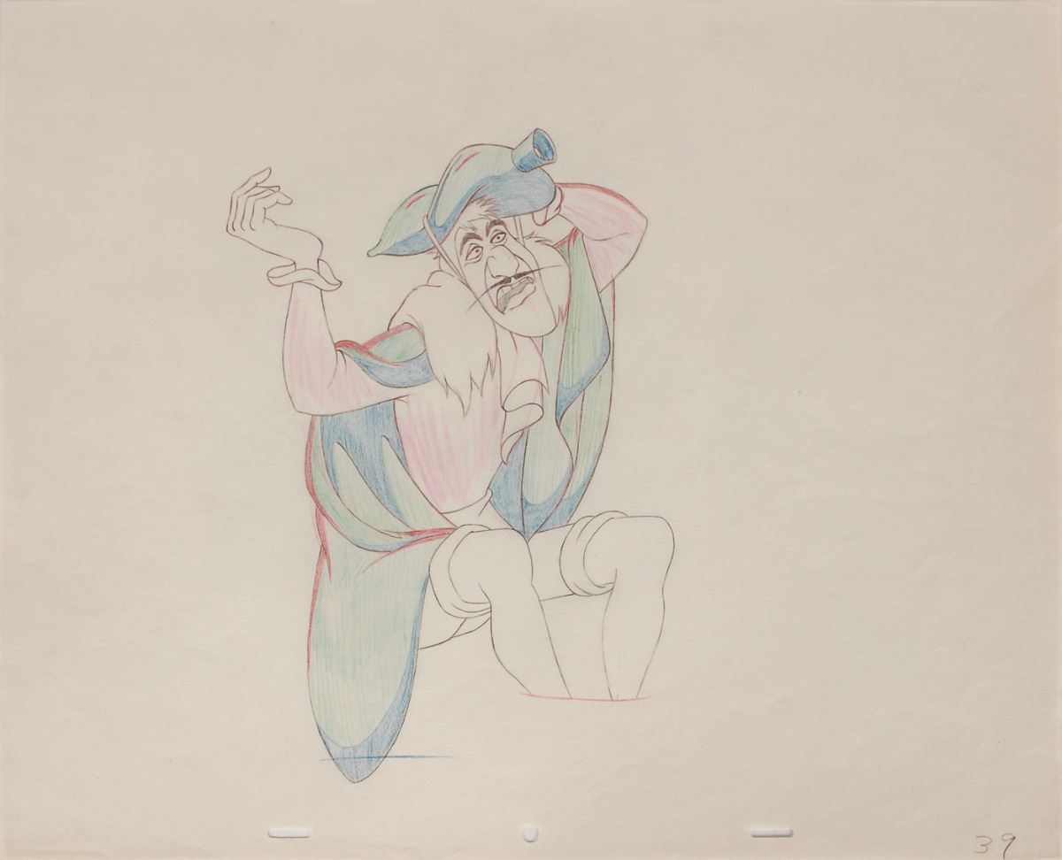 (Walt Disney Studios, 1953) Original production drawing featuring the sick Captain Hook from Peter Pan. Accomplished in graphite and colored pencil on untrimmed 15.5 x 12.5 animation paper. Image measures 6.5 x 9. In fine condition.