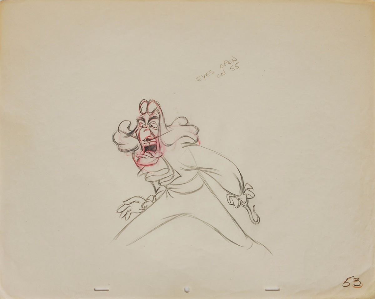 (Walt Disney Studios, 1953) Dramatic original production drawing featuring Captain Hook from Peter Pan, showing the enraged antagonist of the film. Accomplished in graphite and colored pencil on untrimmed 15.5 x 12.5 animation paper. Image measures 6.5 x 6. In fine condition.