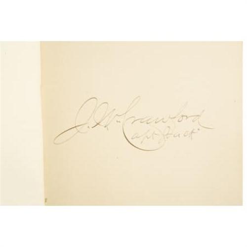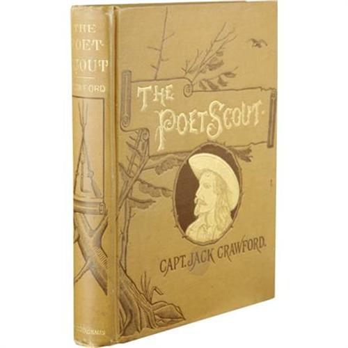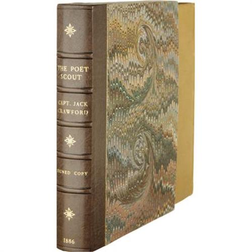<B>Captain Jack Crawford John Wallace : A Wonderful Signed Copy of <I>The Poet Scout. </B></I></B></I><B> A Book of Song and Story.</B></I> By Captain Jack Crawford, (Late Chief of Scouts, U.S. Army). (New York and London: Funk & Wagnalls, 1886). First edition thus, with expanded contents from the 1879 publication with the same title. Beautifully signed by Crawford on a preliminary leaf: “J.W. Crawford; Capt. Jack.” Square octavo (7.5” x 6”). 181, 6, publisher's catalog pp. Illustrated. Publisher's very attractive green cloth decoratively stamped in gilt and dark brown, edges stained green, floral endpapers. Light rubbing around the edges, small stain to front cover, else a spectacular, fine copy. Housed in a custom quarter morocco book-backed slipcase with five raised bands and gilt tooling and lettering on the spine. Crawford, an Irish-born American scout and poet, and a friend of Buffalo Bill, was one of the most picturesque figures in American literary life. As a young boy he ran away and enlisted in the Army and fought in the Civil War, serving with distinction although he was severely wounded. While recovering, he learned to read and write, and soon began a prolific stream of verse, stories and plays of the West. Before publishing this book, he had earned his title by serving as a Government scout under General Crook in the Sitting Bull and other Indian Campaigns.<BR><BR><b>Shipping:</b> Books & Catalogs (<a target="_blank" href="http://www.heritageauctions.com/common/shipping.php">view shipping information</a>)