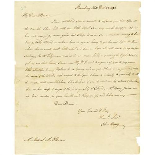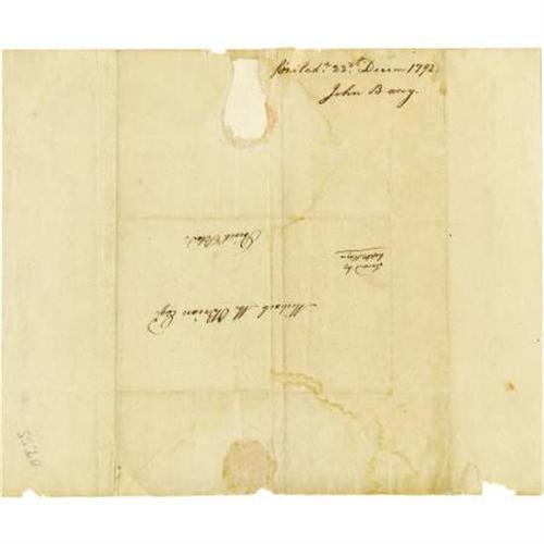 <B>John Barry Autograph Letter Signed</B></I> “<I>John Barry,</B></I>” one page, 8” x 9.75”. Strawberry Hill, December 22, 1792. To Michael M. O'Brian. In part, “<I>I have snatched a few moments to inform you that after all the trouble I have had with our little Vessel I am very much disappointed in her not carrying more goods but I hope it is in some measure owing to her being badly stowed as we have been in a great hurry to get her out before the River close. She is a well built little vessel and I am in hopes she will make it up in fast sailings…</B></I>” Merchant shipmaster John Barry outfitted the first Continental fleet in Philadelphia in the Revolutionary War during which he commanded the <I>Lexington</B></I> and <I>Alliance.</B></I> He was commissioned the first Captain in the Navy when it was permanently organized by Congress in 1794. Barry superintended the building of the frigate <I>United States</B></I> and made several cruises in her with other vessels under his command in the quasi-war with France (1798-1800). He is known as “Father of the Navy.” Three binder indentations at right edge, minor tears at edge. Seal tear on integral address leaf. Fine condition.<BR><BR><b>Shipping:</b> Flat Material, Small (<a target="_blank" href="http://www.heritageauctions.com/common/shipping.php">view shipping information</a>)