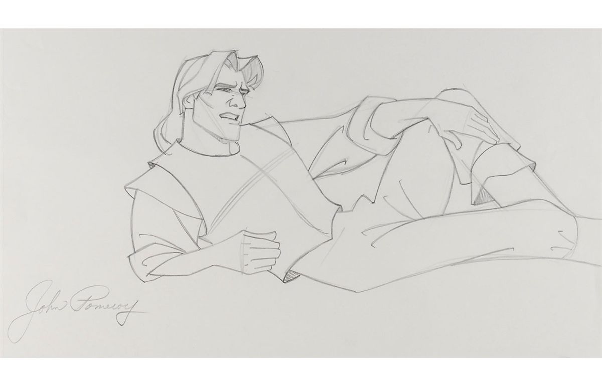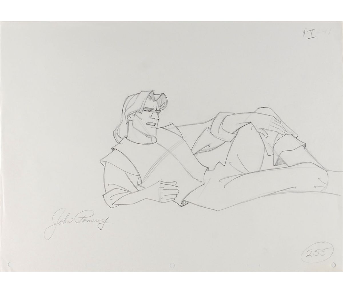 (Walt Disney Studios, 1995) Original production drawing featuring Captain John Smith from Pocahontas. Accomplished in graphite on untrimmed 15.5 x 12.5 animation paper and signed by John Pomeroy. Image of Smith lying on his elbow measures 12 x 6. In fine condition.