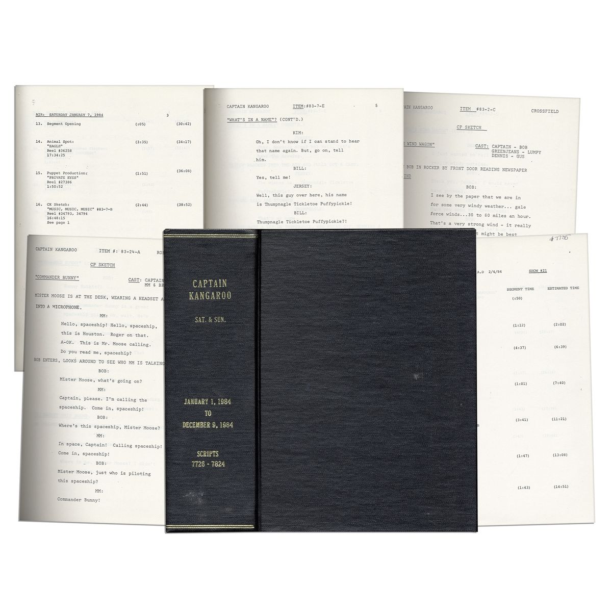 Captain Kangaroo bound show scripts from the 1984 season, weekend episodes. These typed production scripts include episodes 7726 through 7824 and date 2 January 1984 - 9 December 1984. Volume is bound in black cloth boards, gold lettering with title, date and script numbers on backstrip. Volume measures 8.75'' x 11.25'' and weighs 7 pounds. Cocking to spine, else near fine condition.
