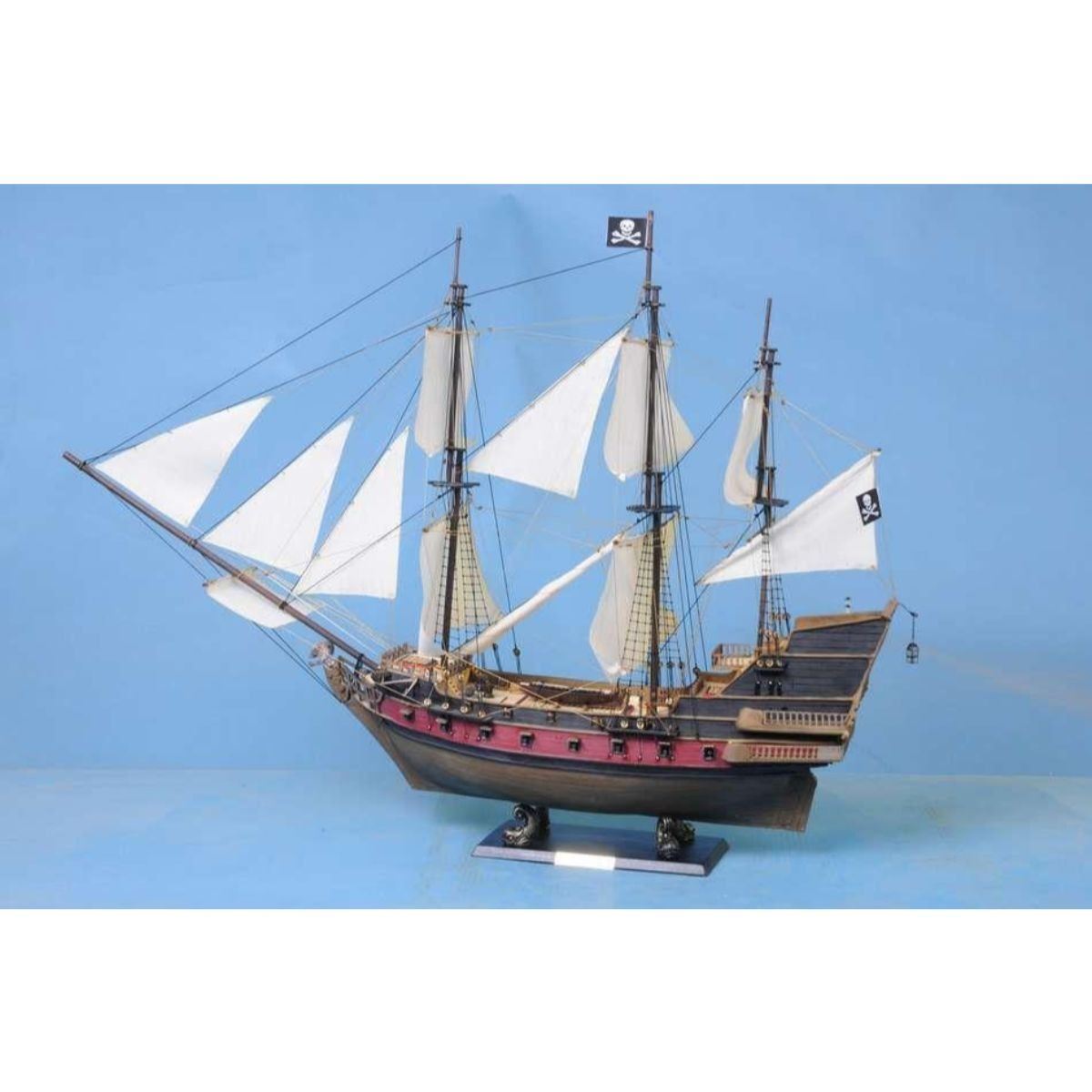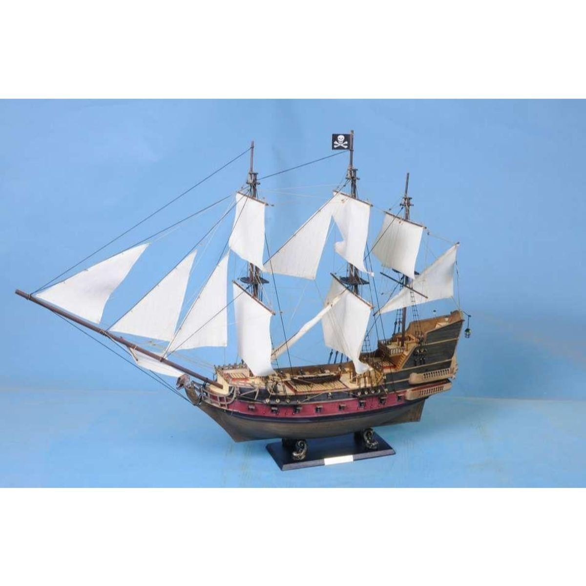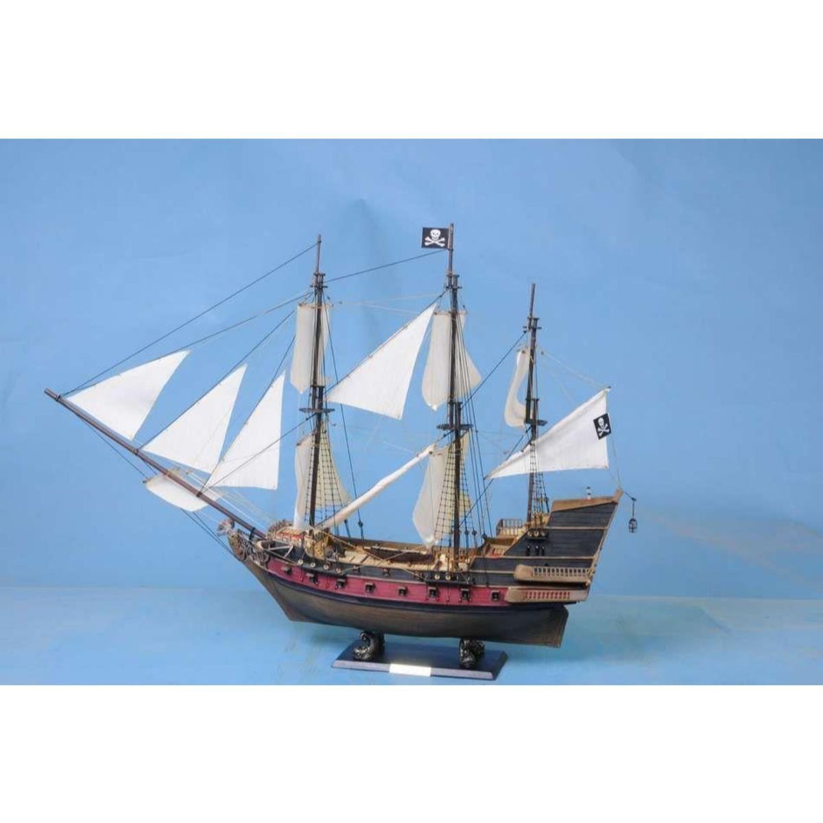 Captain Kidd's Black Falcon Limited Model Pirate Ship 36" - White Sails SOLD FULLY ASSEMBLED Ready for Immediate Display - Not a Model Ship kit Board this exquisitely crafted tall ship model of Captain Kidd's Black Falcon pirate ship and sail into high seas adventure. This model tall ship is a worthy flagship for the commodore of a pirate fleet, and will impress all who look upon her with her fine craftsmanship and unrelenting detail while filling you with the spirit of high seas adventure. Let this masterful Black Falcon pirate tall model ship set her sails from a place of distinction in any home, office, or meeting room as you heave to and prepare to be boarded. Built from scratch over hundreds of hours by our master artisans High quality woods include cherry, birch, maple, and rosewood Individual wooden planks used in hull construction Extensive rigging features over 100 blocks and deadeyes Cannon carriages tied-down to deck to reduce recoil Other Amazing Details, including: Planked deck with nail holes Authentic scale lifeboat with oars Rudder chains, metal anchors, cannonball racks Fine-crafted embellishments carved on stern below twin lanterns Additional deck details such as cannon balls, barrels, rope coils, and other nautical items 10 masterfully stitched, heavy white canvas sails Taut rigging with varied thread gauge and color Wooden display base features four arched dolphins Extensive research of original plans, historical drawings, paintings, and actual photographs ensures the highest possible accuracy