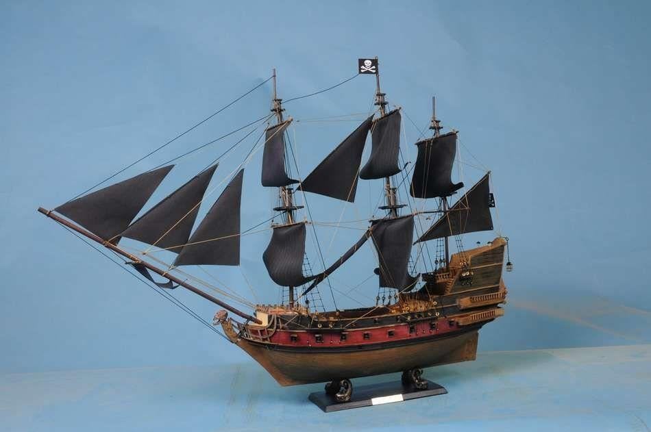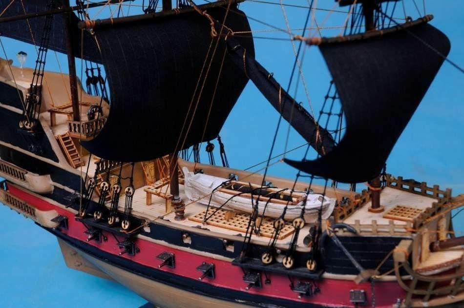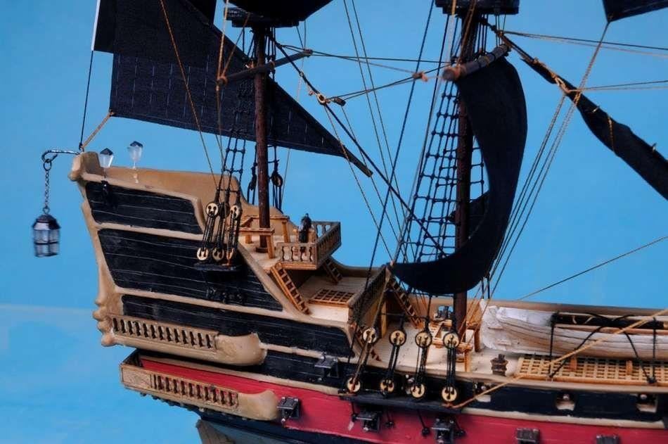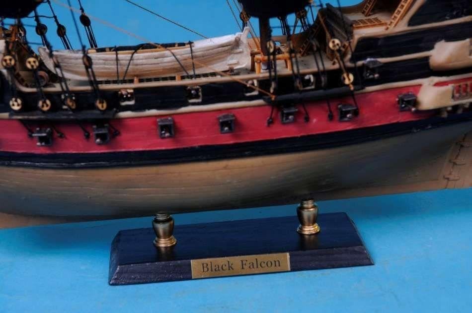 Search for lost treasure as you set sail for adventure on the high seas aboard this scale tall model ship replica of Captain Kidd's Black Falcon pirate ship. This exquisitely constructed sailing ship is highlighted by fine craftsmanship and attention to detail. This Black Falcon pirate ship model proudly displays its exquisitely-crafted features whether seated upon a shelf, desk, or table, and bring an indomitable spirit of adventure to any room or office. Â Built from scratch by our master artisans Individual wooden planks used in hull construction High quality woods include cherry, birch, maple, and rosewood Extensive rigging features over 100 blocks and deadeyes Gun ports actually cut into the hull Amazing Details, including: Planked deck with nail holes Authentic scale lifeboat with oars Rudder chains, metal anchors, cannonball racks Fine-crafted embellishments carved on stern below twin lanterns Additional deck details such as cannon balls, barrels, rope coils, and other nautical items 10 masterfully stitched, heavy black canvas sails Taut rigging with varied thread gauge and color Limited production run of these tall ship models Wooden display base features four arched dolphins Extensive research of original plans, historical drawings, paintings, and actual photographs ensures the highest possible accuracy