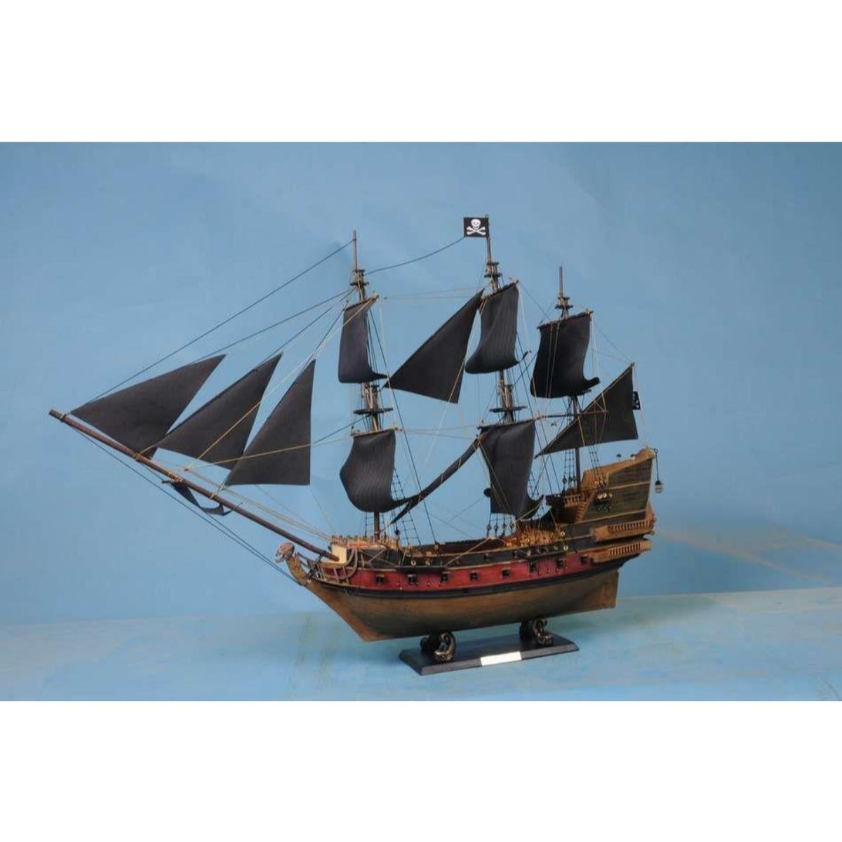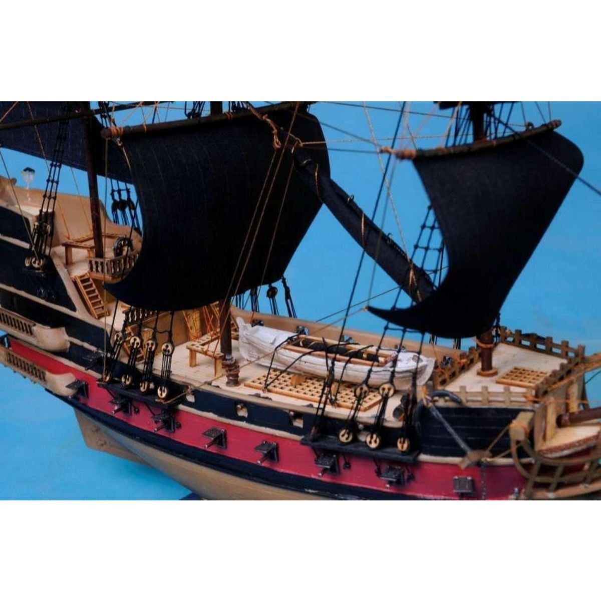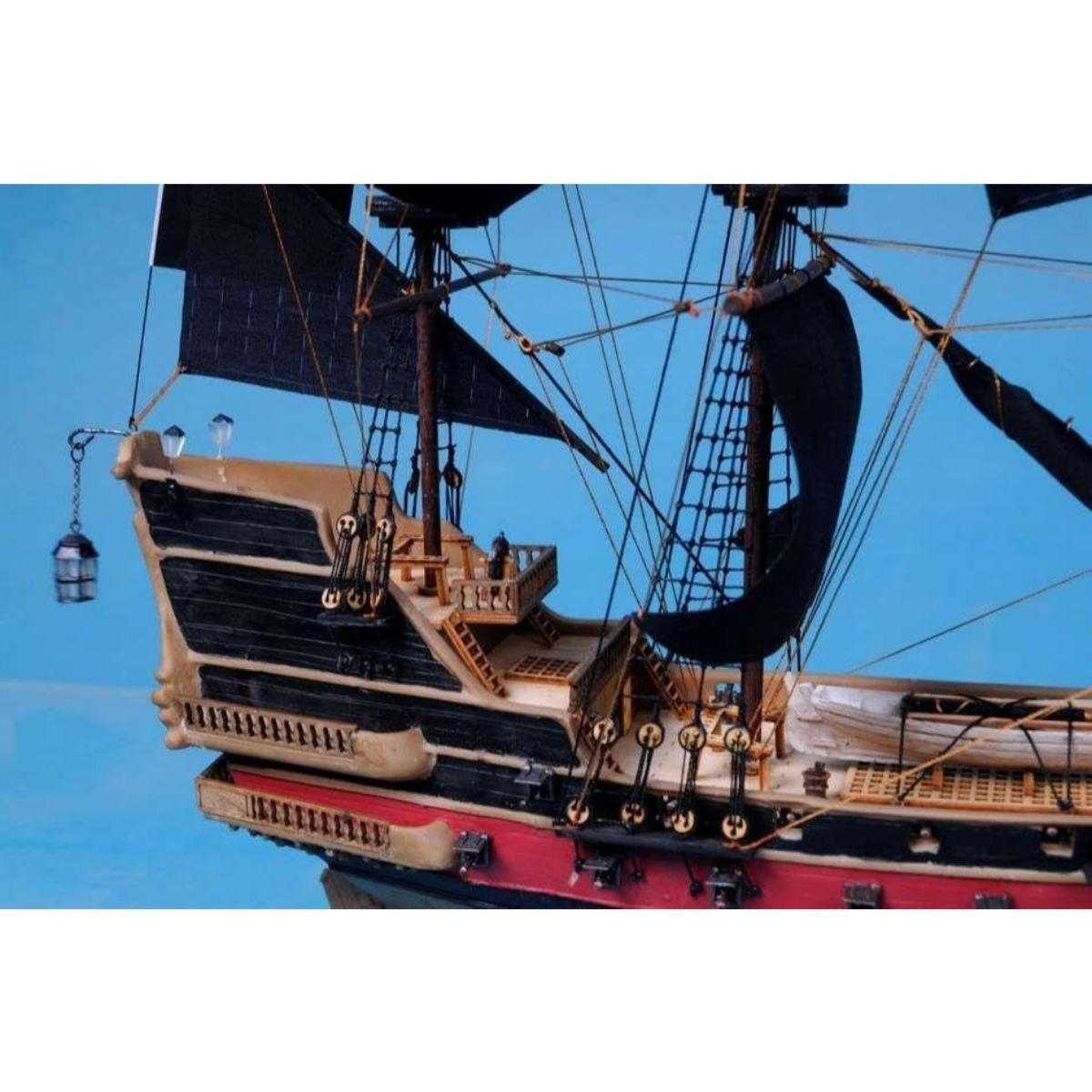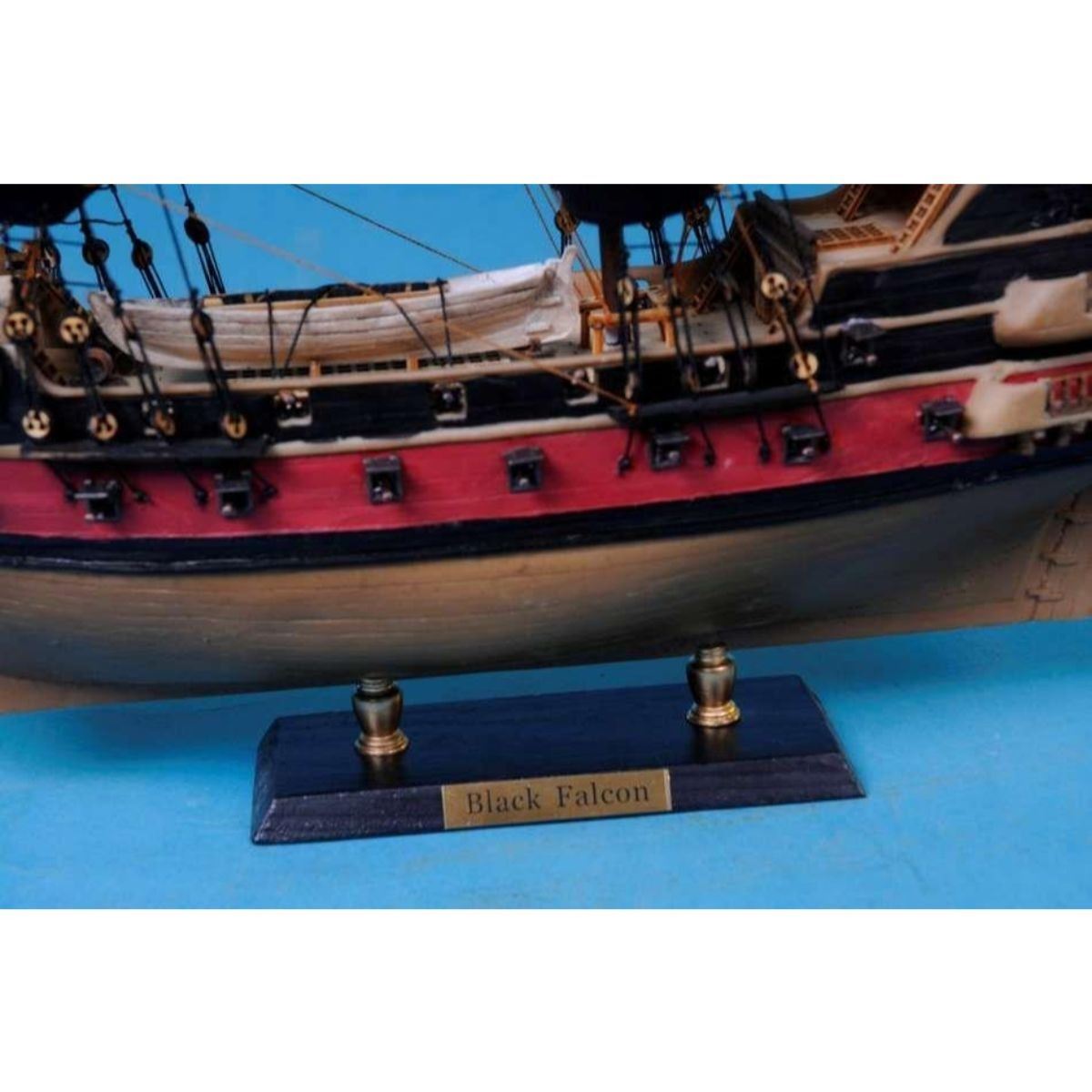 Search for lost treasure as you set sail for adventure on the high seas aboard this scale tall model ship replica of Captain Kidd's Black Falcon pirate ship. This exquisitely constructed sailing ship is highlighted by fine craftsmanship and attention to detail. This Black Falcon pirate ship model proudly displays its exquisitely-crafted features whether seated upon a shelf, desk, or table, and bring an indomitable spirit of adventure to any room or office. Â Built from scratch by our master artisans Individual wooden planks used in hull construction High quality woods include cherry, birch, maple, and rosewood Extensive rigging features over 100 blocks and deadeyes Gun ports actually cut into the hull Amazing Details, including: Planked deck with nail holes Authentic scale lifeboat with oars Rudder chains, metal anchors, cannonball racks Fine-crafted embellishments carved on stern below twin lanterns Additional deck details such as cannon balls, barrels, rope coils, and other nautical items 10 masterfully stitched, heavy black canvas sails Taut rigging with varied thread gauge and color Limited production run of these tall ship models Wooden display base features four arched dolphins Extensive research of original plans, historical drawings, paintings, and actual photographs ensures the highest possible accuracy