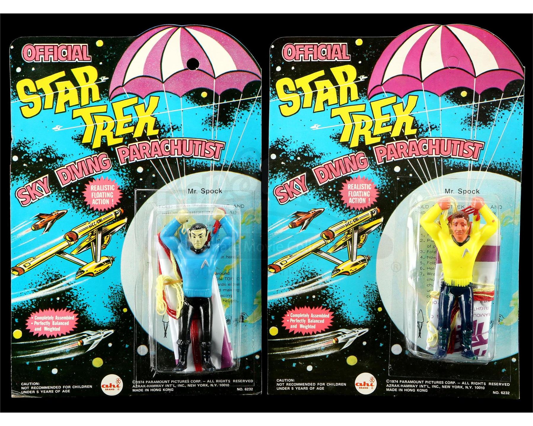 Star Trek (1966-1969)AHI (1974)Two mint carded parachute toys, one punched, one unpunched. These low-cost toys were typically found on wire rack displays at small retailers and grocery and drugstore chains.Condition: Good; some denting to the bubbles and minor wear to the cardbacks.Dimensions: 12" x 8" x 1" (30cm x 20cm x 2.5cm)$300-500