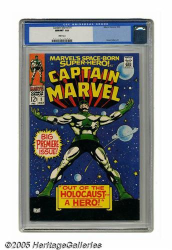 <B>Captain Marvel #1 (Marvel, 1968) CGC NM/MT 9.8 White pages.</B></I> Mar-Vell of the Kree, Marvel's space-born super-hero, got his own title after debuting in <B>Marvel Super-Heroes</B></I>. Gene Colan provided the artwork. This copy is so gorgeous, even Skrulls are bidding on it! Overstreet 2005 NM- 9.2 value = $130. CGC census 3/05: 15 in 9.8, none higher.