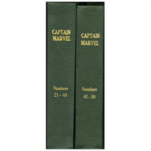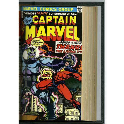 <B>Captain Marvel #21-50 And Others Bound Volumes (Marvel, 1970-76).</B></I> This pair of volumes features copies of <B>Captain Marvel</B></I> #21-50; plus <B>Doctor Strange</B></I> # 11-20 and Annual #1 that have been trimmed and bound into a hardcover volume with the previous owner's name stamped on the cover. Overstreet 2006 VG 4.0 value for group = $129. <BR><BR><B>Important notice:</B> Heritage usually auctions material at the rate of 200-250 lots per hour. On some occasions eBay Live bid software or the Internet may not be able to keep up with the pace of the auction. We recommend placing a realistic absentee bid now as insurance to avoid disappointment. Occasionally the auctioneer may eliminate or reject an eBay Live bid, and the auctioneer may also reopen a lot after the close of the eBay live bidding (usually because we missed an audience bid), and may reject your bid even if it shows you as the winning bidder. By bidding via eBay Live, you agree that Heritage may award the lot to another bidder at its sole discretion under the circumstances described above or any other reasonable circumstances. Since eBay bids are not shown to us until we open the lot on the floor, we treat those bids just like floor bids. In most cases the floor responds before the eBay bid is presented to us, due to Internet lag time, so for consistency we have made it a policy that floor bids are always considered first over tie eBay live bids. Also please note that all Heritage lots purchased through eBay Live carry a 22.5% Buyer's Premium. Please make sure you read the Terms and Conditions before you bid. This lot is being auctioned in conjunction with a live floor auction by Heritage Auction Galleries. All final auction and invoice information will be supplied by Heritage Auction Galleries, and all other information should be considered preliminary. Lot:41001 <BR><BR><B>Winning Notification and Billing:</B> After the FINAL session in this auction is complete, Heritage will send e-mail and snail mail invoices. This process normally takes several days. All final auction and invoice information will be supplied by Heritage Auction Galleries, and all other information should be considered preliminary. <BR><BR>This auction will be conducted on a live auction floor and over the Internet through eBay Live. If you choose to place an absentee bid, please take a moment to <font color='#0000ff'><u><a href='http://pages.ebay.com/liveauctions/help/before/laabsentee.html'>learn how eBay Live absentee bidding works</a></u></font><font color='#000000'>