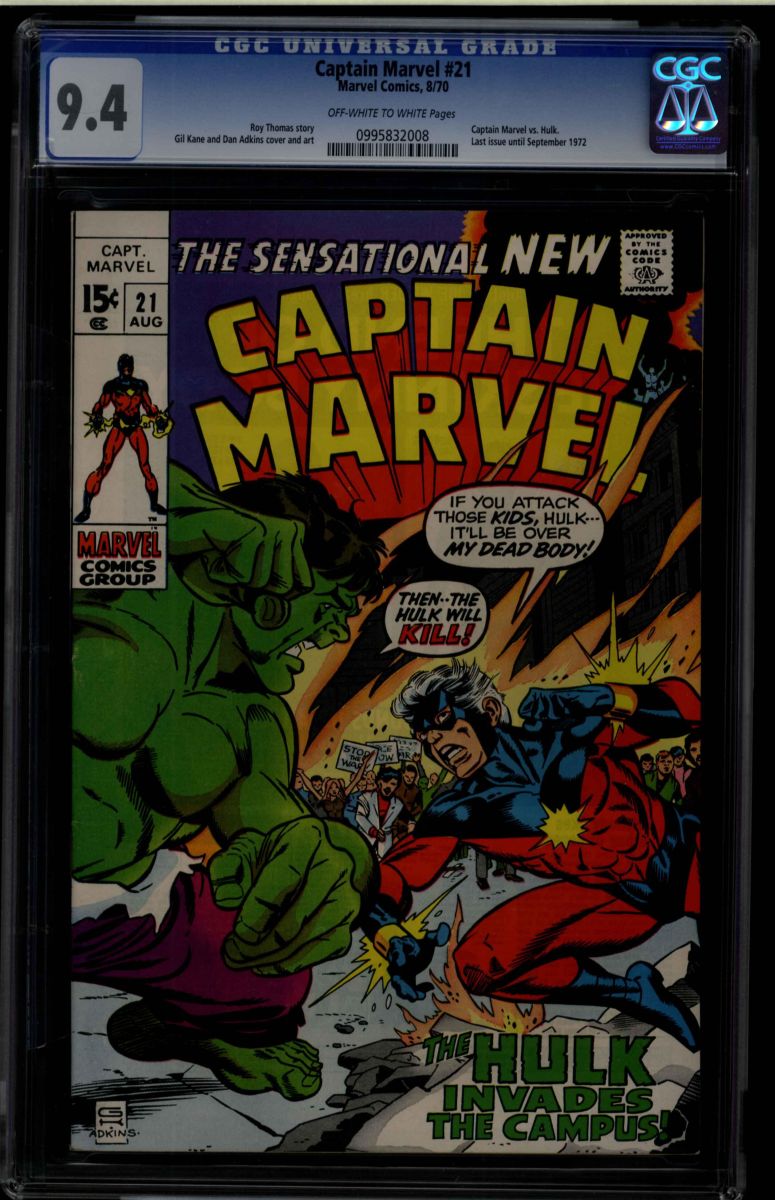 CGC 9.4 Off White to White, Roy Thomas story, Gil Kane and Dan Adkins cover and art. Last issue until September 1972, Captain Marvel vs. Hulk. Overstreet 2009 NM 9.2 value = $40. CGC census: 7 at 9.4, 2 higher.