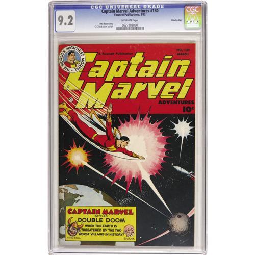 <B>Captain Marvel Adventures #130 Crowley Copy pedigree (Fawcett, 1952) CGC NM- 9.2 Off-white pages.</B></I> C. C. Beck rocket ship cover and art. Overstreet 2006 NM- 9.2 value = $270. CGC census 10/06: 1 in 9.2, none higher.<BR><BR><b>Shipping:</b> Slabbed Comic (<a target="_blank" href="http://www.heritageauctions.com/common/shipping.php">view shipping information</a>)