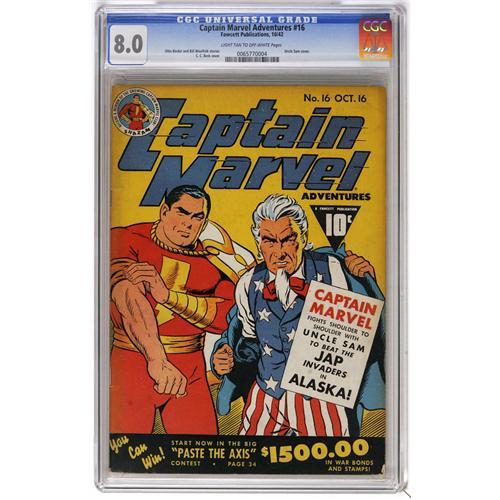 <B>Captain Marvel Adventures #16 (Fawcett, 1942) CGC VF 8.0 Light tan to off-white pages.</B></I> Uncle Sam and Captain Marvel get ready to wrap up this war business in short order, on this dynamic C. C. Beck cover. What patriotic kid in 1942 wouldn't want to spend a dime on this comic? In this issue, the Big Red Cheese keeps the invaders out of the Alaskan territory (remember, Alaska wasn't a state yet). Overstreet 2006 VF 8.0 value = $544. CGC census 3/06: 1 in 8.0, 6 higher.