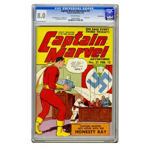 <B>Captain Marvel Adventures #21 Crowley Copy pedigree (Fawcett, 1943) CGC VF 8.0 Off-white pages.</B></I> Captain Marvel gives Adolf Hitler a blast from his "Honesty Ray" on this cover by C. C. Beck. Al Liederman provided the story and interior art. Overstreet 2005 VF 8.0 value = $563. CGC census 12/05: 1 in 8.0, 4 higher.