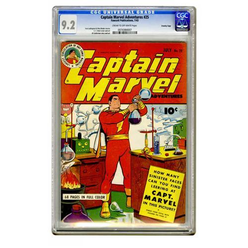 <B>Captain Marvel Adventures #25 Crowley Copy pedigree (Fawcett, 1943) CGC NM- 9.2 Cream to off-white pages.</B></I> As Captain Marvel mixes chemicals together in the lab, several faces disguised within the surrounding components stare him down, on this clever cover by C. C. Beck. The interior story and art was handled by Al Liederman. Overstreet 2005 NM- 9.2 value = $875. CGC census 11/05: 2 in 9.2, 1 higher.