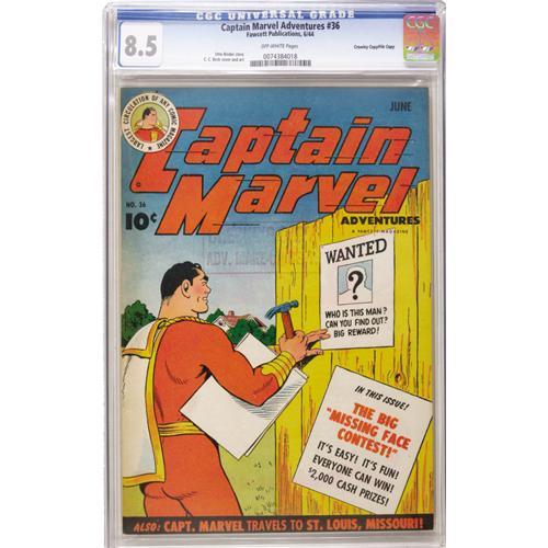 <B>Captain Marvel Adventures #36 Crowley Copy/File Copy (Fawcett, 1944) CGC VF+ 8.5 Off-white pages.</B></I> Captain Marvel visits St. Louis, Missouri in this issue. This copy is one of the nicest we've had the opportunity to offer. The cover bears a faint "checking copy" stamp. Overstreet 2006 VF 8.0 value = $196; VF/NM 9.0 value = $291. CGC census 10/06: 3 in 8.5, 2 higher.<BR><BR><b>Shipping:</b> Slabbed Comic (<a target="_blank" href="http://www.heritageauctions.com/common/shipping.php">view shipping information</a>)
