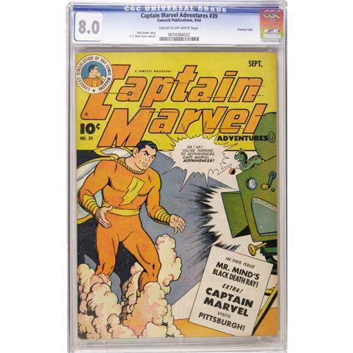 <B>Captain Marvel Adventures #39 Crowley Copy pedigree (Fawcett, 1944) CGC VF 8.0 Cream to off-white pages.</B></I> Captain Marvel's nemesis, Mr. Mind, annoys our hero again in this issue. Overstreet 2006 VF 8.0 value = $287. CGC census 10/06: 2 in 8.0, 4 higher.<BR><BR><b>Shipping:</b> Slabbed Comic (<a target="_blank" href="http://www.heritageauctions.com/common/shipping.php">view shipping information</a>)