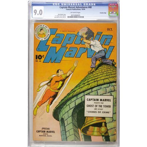 <B>Captain Marvel Adventures #40 Crowley Copy pedigree (Fawcett, 1944) CGC VF/NM 9.0 Off-white pages.</B></I> C. C. Beck cover and art. Dick McCay art. Otto Binder story. Overstreet 2006 VF/NM 9.0 value = $449; NM- 9.2 value = $610. CGC census 10/06: 2 in 9.0, none higher.<BR><BR><b>Shipping:</b> Slabbed Comic (<a target="_blank" href="http://www.heritageauctions.com/common/shipping.php">view shipping information</a>)