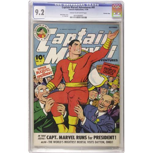 <B>Captain Marvel Adventures #41 Crowley Copy pedigree (Fawcett, 1944) CGC NM- 9.2 Cream to off-white pages.</B></I> Undecided whom to vote for in the upcoming elections? Here's a possible candidate for you, as "Captain Marvel Runs for President." Captain Marvel visits Dayton, Ohio in this issue's "city story," with art by C.C. Beck. This copy ties with one other for the status as the highest graded copy to date. Overstreet 2006 NM- 9.2 value = $480. CGC census 10/06: 2 in 9.2, none higher.<BR><BR><b>Shipping:</b> Slabbed Comic (<a target="_blank" href="http://www.heritageauctions.com/common/shipping.php">view shipping information</a>)
