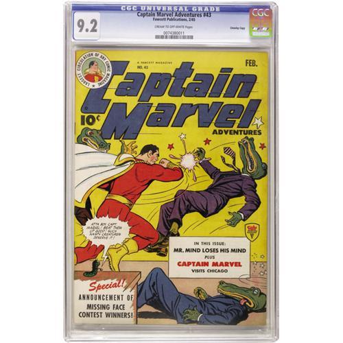 <B>Captain Marvel Adventures #43 Crowley Copy pedigree (Fawcett, 1945) CGC NM- 9.2 Cream to off-white pages.</B></I> Captain Marvel meets Uncle Marvel for the first time in this issue, and Mary Marvel makes a cameo appearance. This is the highest graded of this issue certified to date. Overstreet 2006 NM- 9.2 value = $480. CGC census 10/06: 1 in 9.2, none higher.<BR><BR><b>Shipping:</b> Slabbed Comic (<a target="_blank" href="http://www.heritageauctions.com/common/shipping.php">view shipping information</a>)