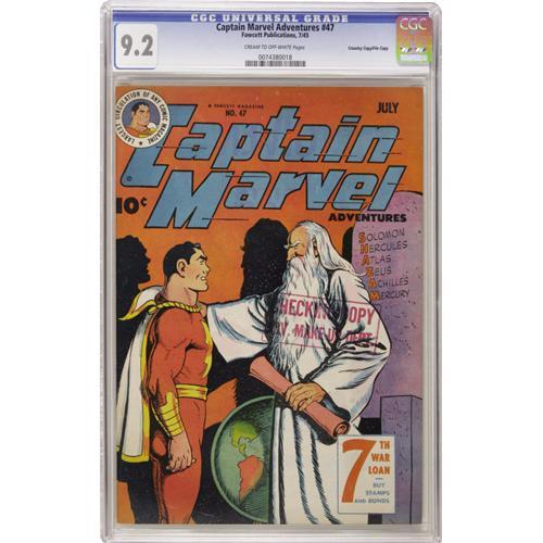 <B>Captain Marvel Adventures #47 Crowley Copy/File Copy (Fawcett, 1945) CGC NM- 9.2 Cream to off-white pages.</B></I> Currently, only one other copy of this issue has graded higher than this one, which bears a "checking copy" stamp on the front cover. Overstreet 2006 NM- 9.2 value = $440. CGC census 10/06: 2 in 9.2, 1 higher.<BR><BR><b>Shipping:</b> Slabbed Comic (<a target="_blank" href="http://www.heritageauctions.com/common/shipping.php">view shipping information</a>)