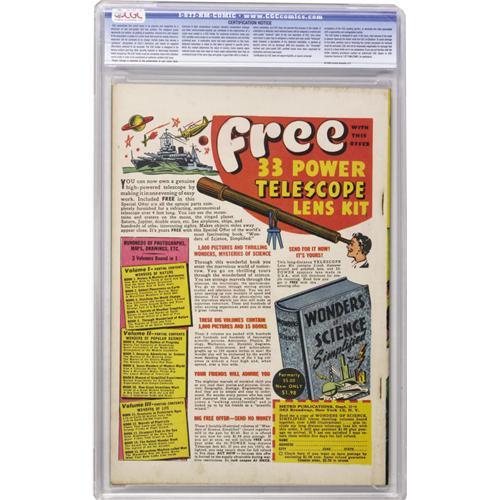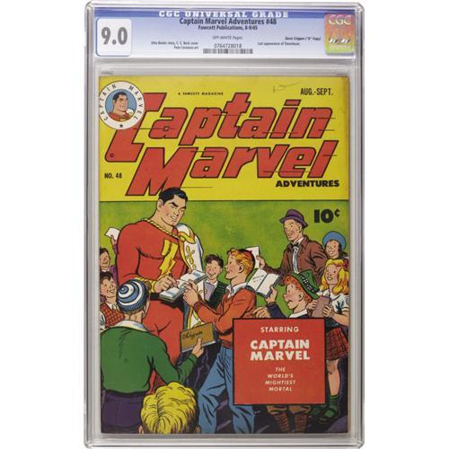 The ever-appealing art of C. C. Beck graces the cover. It's worth noting that this issue had the last appearance of Steamboat, Captain Marvel's loyal pal who was a likeable character in these Otto Binder stories but whom the modern reader can only see as a fairly crass racial caricature. Since these stories are likely never to be reprinted again for that reason, a collector's only option is to get the original. Overstreet 2006 VF/NM 9.0 value = $331; NM- 9.2 value = $440. CGC census 12/06: 1 in 9.0, 3 higher. <I>From the Crippen Collection.</B></I><BR><BR><b>Shipping:</b> Slabbed Comic (<a target="_blank" href="http://www.heritageauctions.com/common/shipping.php">view shipping information</a>)