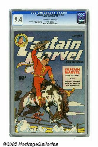 <B>Captain Marvel Adventures #51 (Fawcett, 1946) CGC NM 9.4 Off-white to white pages.</B></I> C. C. Beck's ride-'em cowboy cover has the good Captain bronco busting, as "Captain Marvel Goes Western!" This is a sweet copy, with razor-sharp edges and tight corners. Ride 'em, Cap! Overstreet 2005 NM- 9.2 value = $360. CGC census 7/05: 4 in 9.4, 1 higher.
