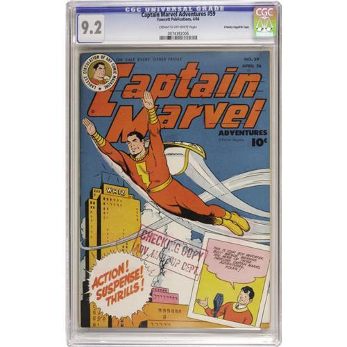 <B>Captain Marvel Adventures #59 Crowley Copy/File Copy (Fawcett, 1946) CGC NM- 9.2 Cream to off-white pages.</B></I> Checking Copy stamp on cover. Overstreet 2006 NM- 9.2 value = $375. CGC census 10/06: 2 in 9.2, none higher.<BR><BR><b>Shipping:</b> Slabbed Comic (<a target="_blank" href="http://www.heritageauctions.com/common/shipping.php">view shipping information</a>)