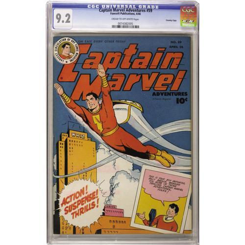 <B>Captain Marvel Adventures #59 Crowley Copy pedigree (Fawcett, 1946) CGC NM- 9.2 Cream to off-white pages.</B></I> C. C. Beck cover. Pete Costanza art. Overstreet 2006 NM- 9.2 value = $375. CGC census 11/06: 2 in 9.2, none higher.<BR><BR><b>Shipping:</b> Slabbed Comic (<a target="_blank" href="http://www.heritageauctions.com/common/shipping.php">view shipping information</a>)