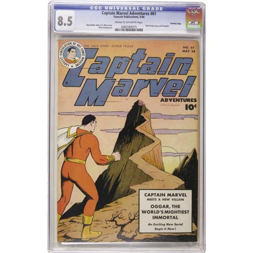 <B>Captain Marvel Adventures #61 Crowley Copy pedigree (Fawcett, 1946) CGC VF+ 8.5 Cream to off-white pages.</B></I> "The Cult of the Curse" serial begins with this issue. Overstreet 2006 VF 8.0 value = $210; VF/NM 9.0 value = $313. CGC census 10/06: 2 in 8.5, 1 higher.<BR><BR><b>Shipping:</b> Slabbed Comic (<a target="_blank" href="http://www.heritageauctions.com/common/shipping.php">view shipping information</a>)