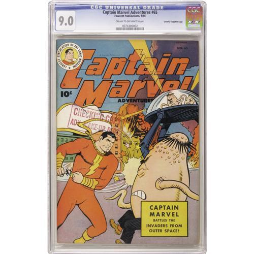 <B>Captain Marvel Adventures #65 Crowley Copy/File Copy (Fawcett, 1946) CGC VF/NM 9.0 Cream to off-white pages.</B></I> Contains a Mary Marvel crossover. Checking Copy stamp on cover. Overstreet 2006 VF/NM 9.0 value = $284; NM- 9.2 value = $375. CGC census 10/06: 1 in 9.0, 1 higher.<BR><BR><b>Shipping:</b> Slabbed Comic (<a target="_blank" href="http://www.heritageauctions.com/common/shipping.php">view shipping information</a>)