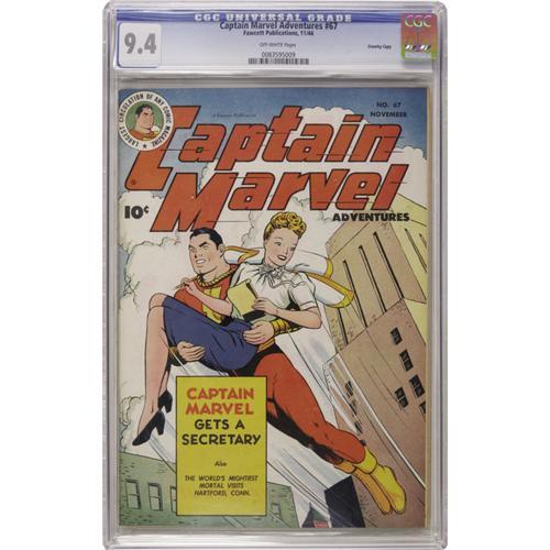 <B>Captain Marvel Adventures #67 Crowley Copy pedigree (Fawcett, 1946) CGC NM 9.4 Off-white pages.</B></I> Captain Marvel gets a secretary in this issue, and visits Hartford, Connecticut in one of his ever-popular "City Stories." C. C. Beck provided the cover art. Overstreet 2006 NM- 9.2 value = $325. CGC census 10/06: 1 in 9.4, none higher.<BR><BR><b>Shipping:</b> Slabbed Comic (<a target="_blank" href="http://www.heritageauctions.com/common/shipping.php">view shipping information</a>)