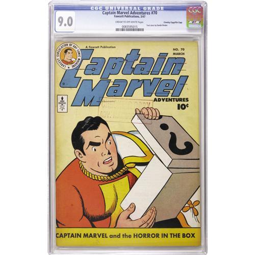 <B>Captain Marvel Adventures #70 Crowley Copy/File Copy (Fawcett, 1947) CGC VF/NM 9.0 Cream to off-white pages.</B></I> Text story by Eando Binder. Checking Copy stamp on cover. Overstreet 2006 VF/NM 9.0 value = $246; NM- 9.2 value = $325. CGC census 10/06: 2 in 9.0, 1 higher.<BR><BR><b>Shipping:</b> Slabbed Comic (<a target="_blank" href="http://www.heritageauctions.com/common/shipping.php">view shipping information</a>)