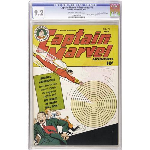 <B>Captain Marvel Adventures #71 Crowley Copy/File Copy (Fawcett, 1947) CGC NM- 9.2 Cream to off-white pages.</B></I> Three Lt. Marvels appearances. Checking Copy stamp on cover. Overstreet 2006 NM- 9.2 value = $325. CGC census 10/06: 3 in 9.2, none higher.<BR><BR><b>Shipping:</b> Slabbed Comic (<a target="_blank" href="http://www.heritageauctions.com/common/shipping.php">view shipping information</a>)
