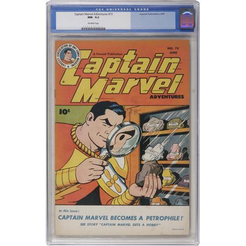 <B>Captain Marvel Adventures #73 (Fawcett, 1947) CGC NM- 9.2 Off-white pages.</B></I> C. C. Beck cover. Note that a small plastic stabilizing peg is loose inside the CGC holder, not affecting the comic itself or the integrity of the holder. Overstreet 2006 NM- 9.2 value = $325. CGC census 3/07: 1 in 9.2, none higher.<BR><BR><b>Shipping:</b> Comics - Slabbed (certified) (<a target=""_blank"" href=""http://www.heritageauctions.com/common/shipping.php"">view shipping information</a>)