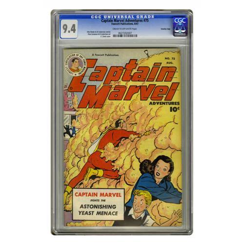 <B>Captain Marvel Adventures #75 Crowley Copy pedigree (Fawcett, 1947) CGC NM 9.4 Cream to off-white pages.</B></I> The Big Red Cheese faces a rather sticky problem (and how!) on this issue's C. C. Beck cover. Yuck! There's nothing to complain about with this clean, pedigreed copy, however -- it tops the current CGC census list. Overstreet 2005 NM- 9.2 value = $310. CGC census 11/05: 1 in 9.4, none higher.
