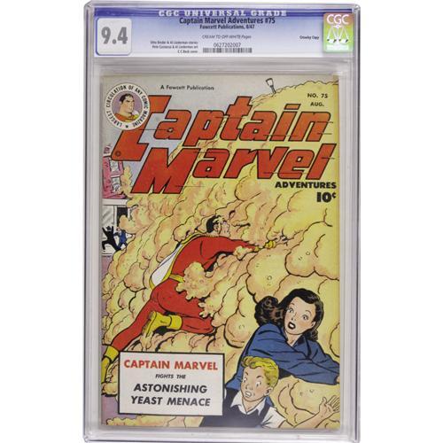 <B>Captain Marvel Adventures #75 Crowley Copy pedigree (Fawcett, 1947) CGC NM 9.4 Cream to off-white pages.</B></I> C. C. Beck cover. Pete Costanza art. Overstreet 2006 NM- 9.2 value = $325. CGC census 10/06: 1 in 9.4, none higher.<BR><BR><b>Shipping:</b> Slabbed Comic (<a target="_blank" href="http://www.heritageauctions.com/common/shipping.php">view shipping information</a>)