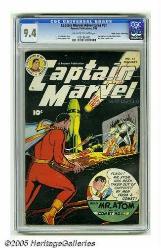 <B>Captain Marvel Adventures #81 Mile High pedigree (Fawcett, 1948) CGC NM 9.4 Off-white to white pages.</B></I> This black-background copy of <B>Captain Marvel Adventures</B></I> (with its cool rocket ship and robot graphics, and Mr. Atom appearance) is a tough book to find in high grade; heck, it's a little tough to find in <I>any</B></I> condition! In fact, this incredibly fresh-looking Edgar Church copy is only the sixth copy certified by CGC to date. Of course, being a Mile High copy, it has to be the best! Overstreet 2005 NM- 9.2 value = $290. CGC census 7/05: 1 in 9.4, none higher.