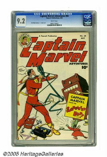 <B>Captain Marvel Adventures #84 (Fawcett, 1948) CGC NM- 9.2 White pages.</B></I> C. C. Beck cover. Overstreet 2005 NM- 9.2 value = $290. CGC census 7/05: 2 in 9.2, none higher.