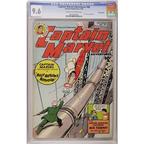<B>Captain Marvel Adventures #88 Crowley Copy pedigree (Fawcett, 1948) CGC NM+ 9.6 Cream to off-white pages.</B></I> A beautiful pedigree copy. Mr. Tawny appearance. C. C. Beck cover art. Overstreet 2006 NM- 9.2 value = $300. CGC census 9/06: 1 in 9.6, none higher.<BR><BR><b>Shipping:</b> Slabbed Comic (<a target="_blank" href="http://www.heritageauctions.com/common/shipping.php">view shipping information</a>)