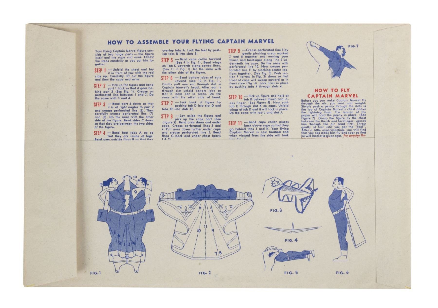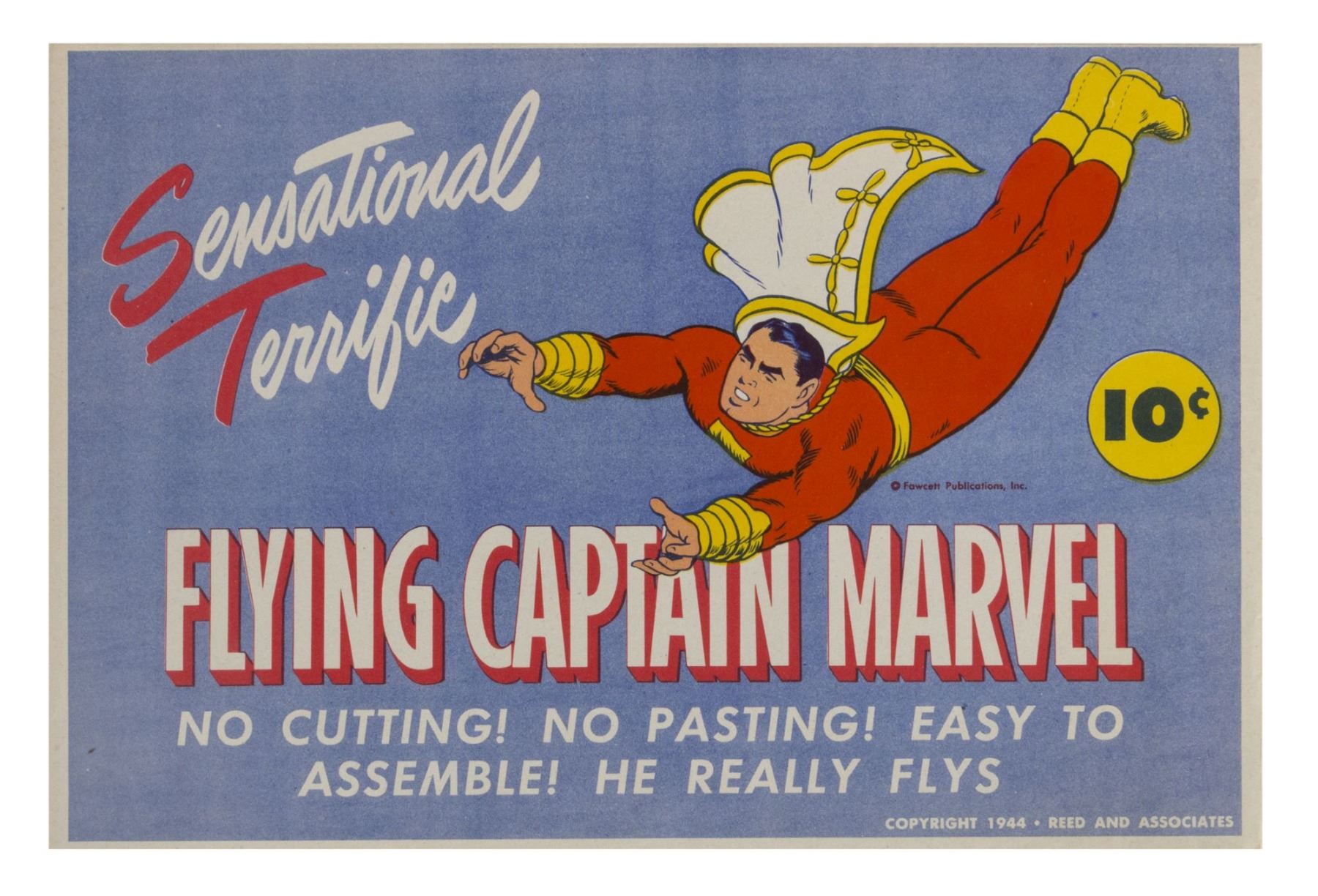 (DC, 1944) A paper flying toy titled, "Flying Captain Marvel" created by Reed and Associates. This foldable paper toy features the iconic DC superhero, Captain Marvel, and features great colorful imagery of the character on the front of the envelope. The toy is complete in its original envelope and has not been punched out. Measuring 7"x10", the condition is very good with little wear.