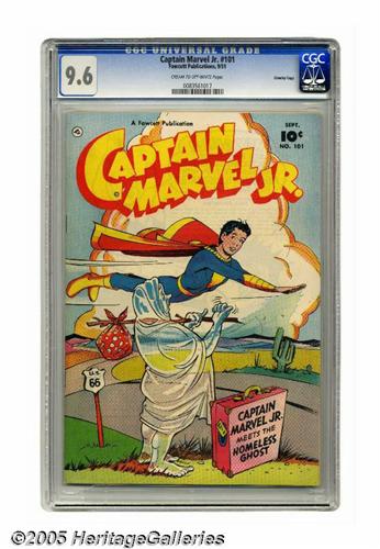 <B>Captain Marvel Jr. #101 Crowley Copy pedigree (Fawcett, 1951) CGC NM+ 9.6 Cream to off-white pages.</B></I> This comic has colors of the kind only seen on a pedigree book - it looks fantastic! This is the first time we've offered this particular issue here at Heritage. Overstreet 2005 NM- 9.2 value = $210. CGC census 6/05: 2 in 9.6, none higher.