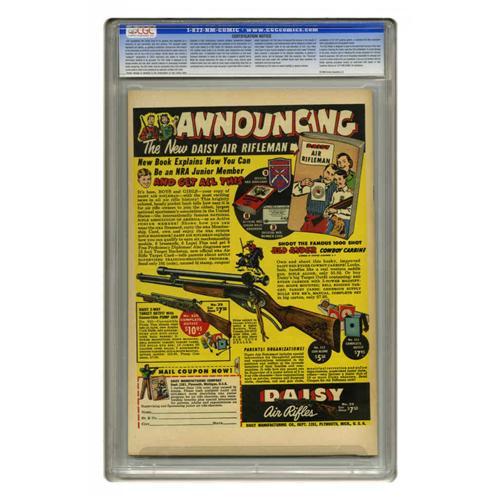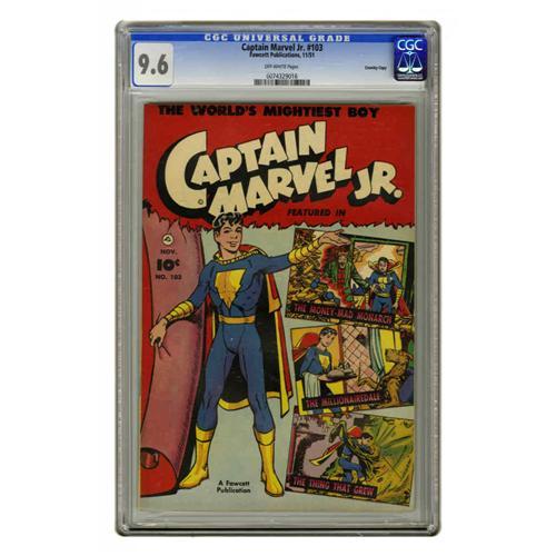 <B>Captain Marvel Jr. #103 Crowley Copy pedigree (Fawcett, 1951) CGC NM+ 9.6 Off-white pages.</B></I> The World's Mightiest Boy presents three big adventures, including one featuring a Blob-like creature ("The Thing That Grew"), and another starring the ultimate in pampered pooches ("The Millionairedale" -- no, we're not making this up!) on the cover to this issue. This Wendell Crowley pedigreed copy once again tops the current CGC census charts. Overstreet 2005 NM- 9.2 value = $210. CGC census 11/05: 1 in 9.6, none higher.