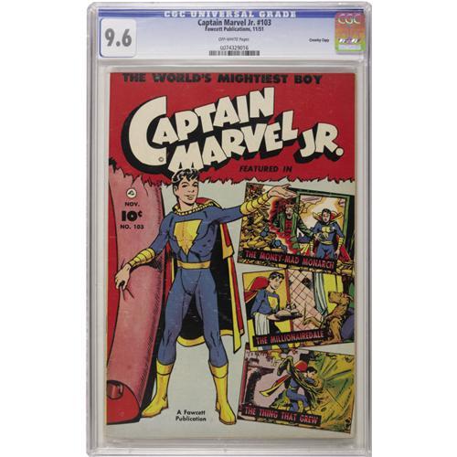 <B>Captain Marvel Jr. #103 Crowley Copy pedigree (Fawcett, 1951) CGC NM+ 9.6 Off-white pages.</B></I> This is the highest graded copy certified by CGC to date, and the first we've ever had the chance to offer. Overstreet 2006 NM- 9.2 value = $220. CGC census 10/06: 1 in 9.6, none higher.<BR><BR><b>Shipping:</b> Slabbed Comic (<a target="_blank" href="http://www.heritageauctions.com/common/shipping.php">view shipping information</a>)
