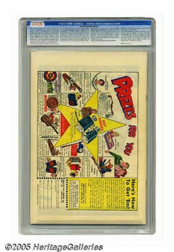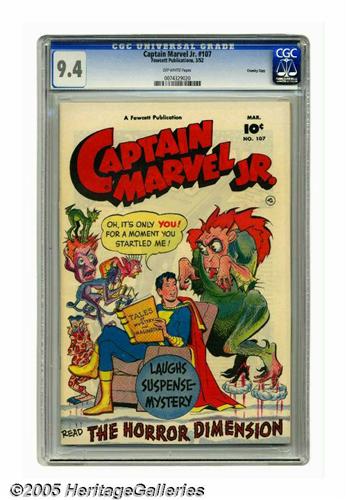 <B>Captain Marvel Jr. #107 Crowley Copy pedigree (Fawcett, 1952) CGC NM 9.4 Off-white pages.</B></I> A look at this white-cover copy with its perfect corners will have you thinking a 9.4 grade almost seems a bit conservative! We hadn't seen this particular issue before; it's from late in the title's run, and it's an interesting hybrid with its horror/mystery overtones. Overstreet 2005 NM- 9.2 value = $270. CGC census 6/05: 1 in 9.4, 1 higher.